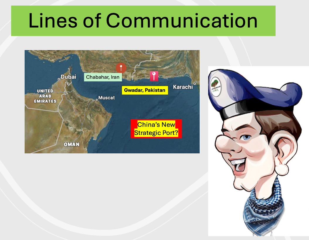 So, they went off to do that but Splash looked at the map and said that if the Chinese secured development rights at Gwadar, it would put a PRC naval base astride most of the oil shipping out of the UAE, Oman and Saudi Arabia across the Indian Ocean. And the good ‘ole USN is looking at the little nation of Mauritius throwing us out of our distant base down south at Diego Garcia.